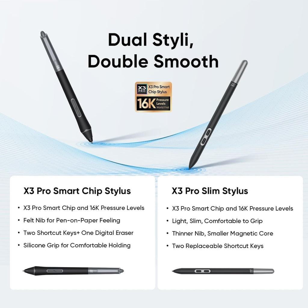 Dual Stylus, Double Smooth: The X3 Pro Slim Stylus is a lightweight stylus that features removable buttons to avoid accidental touches, while the X3 Pro Smart Chip Stylus has a comfortable silicone grip for long creative sessions. Both styluses are battery-free and have 16,384 pressure levels and a 60° tilt function for a smooth drawing experience. The pen case holds both styluses, acts as a stand, and includes 28 extra nibs and 2 detachable pen clips for easy replacement