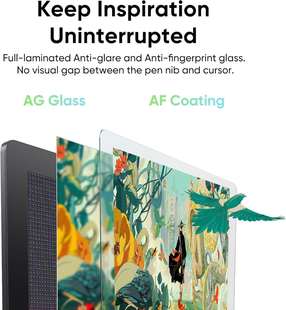 Paper-feel Drawing Experience: Featuring AG Nano Etched and AF Coating glass, this advanced technology, offers a paper-feel drawing experience by minimizing distractions with its anti-glare and anti-fingerprint properties. The full-laminated display eliminates visual gaps between the pen nib and cursor, enhancing precision and accuracy in every stroke