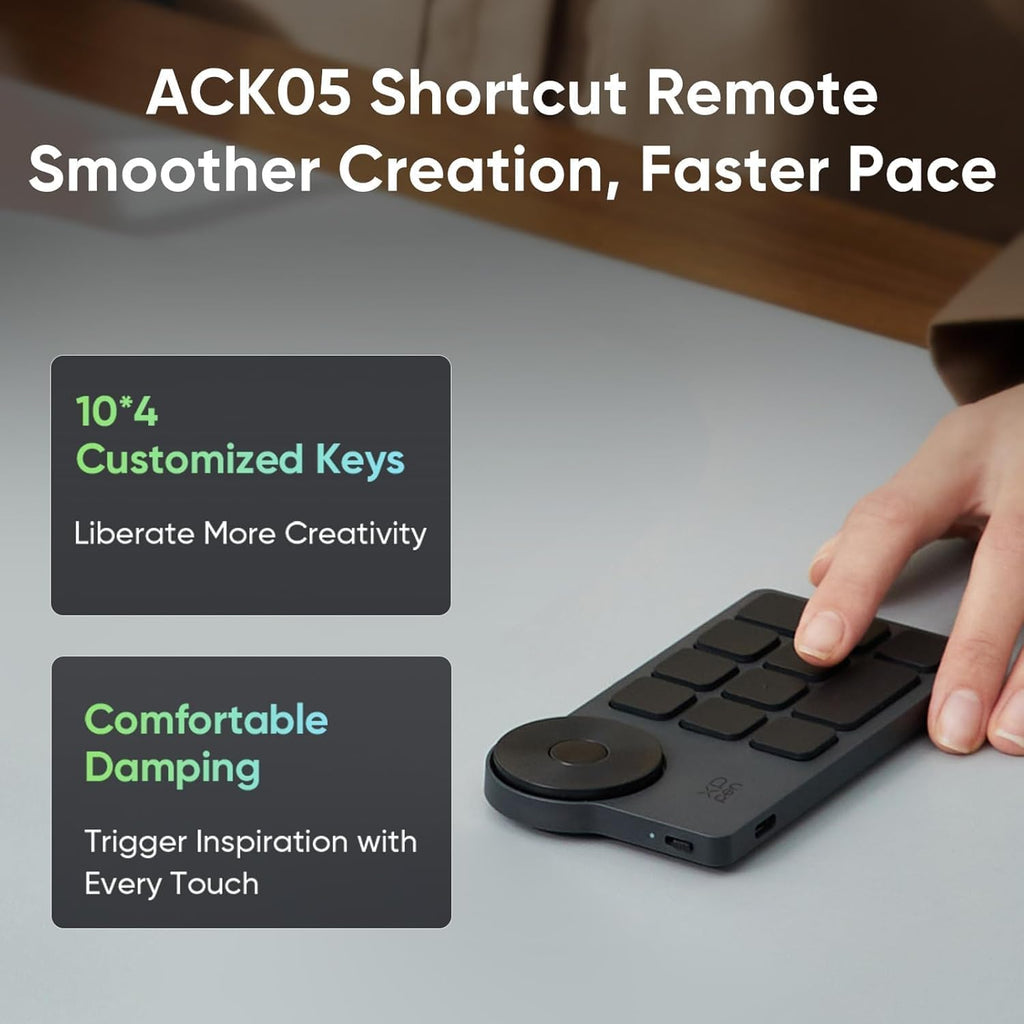 ACK05 Wireless Shortcut Keyboard: Featuring a standout physical dial for comfortable rotation and precise feedback, this remote boasts ten customizable keys. Awarded the Good Design Award 2023, it supports Bluetooth 5.0, enhancing your workspace flexibility and efficiency.