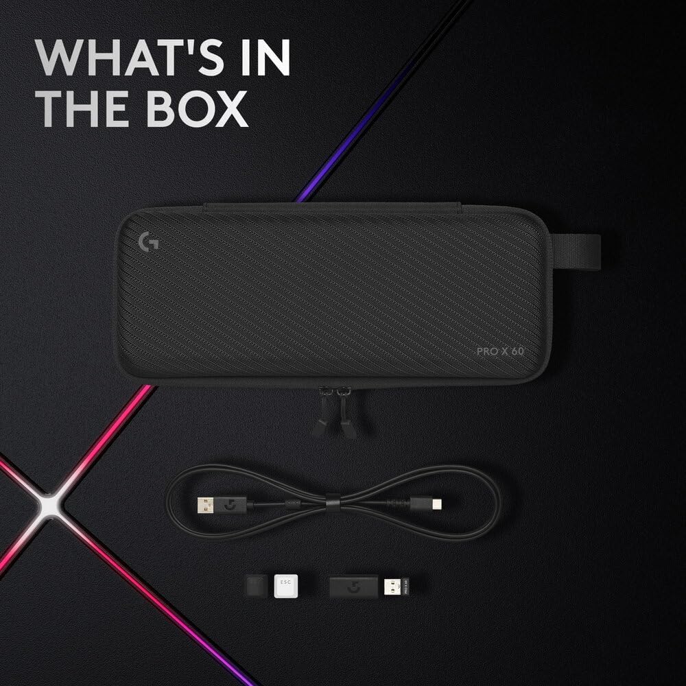 • Contents: PRO X 60 Wireless Gaming Keyboard, USB LIGHTSPEED wireless adapter, USB-A to USB-C charging and data cable (6 ft./1.8 m), Logitech G keycap, carrying case and user documentation