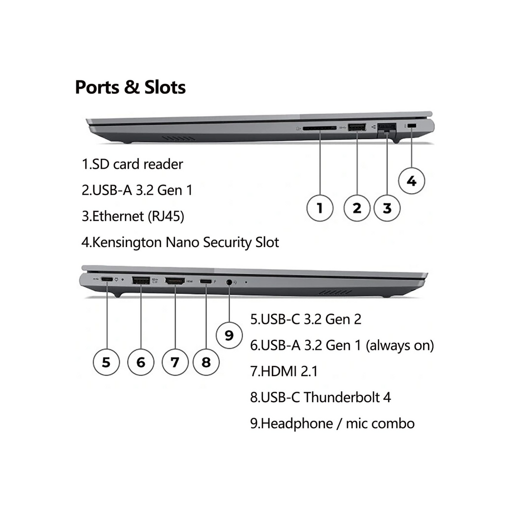 • ■ Wireless ■ Wi-Fi 6, 11ax 2x2 and Bluetooth 5.2. 1x USB 3.2 Gen 1, 1x USB 3.2 Gen 1 (Always On), 1x USB-C 3.2 Gen 2, 1x Thunderbolt 4 / USB4 40Gbps, 1x HDMI 2.1, up to 4K/60Hz, 1x SD card reader, 1x Ethernet (RJ-45), 1x Headphone / microphone combo jack (3.5mm).