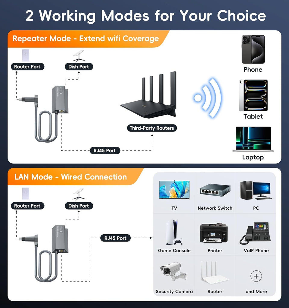 • 【Two Working Modes for Your Choice】This starlinkg v2 Ethernet adapter has two working modes (repeater mode and LAN mode). For repeater mode, use adapter connecting with a third-party router to extend the network signal coverage to places where the original signal is not good, so that you can connect your mobile phone, tablet computer, and laptop to the Internet freely; for LAN mode, you can use wired connections to TVs, network switches, game consoles, printers, VolP phones, security cameras, routers, etc. to make the network connection more stable.