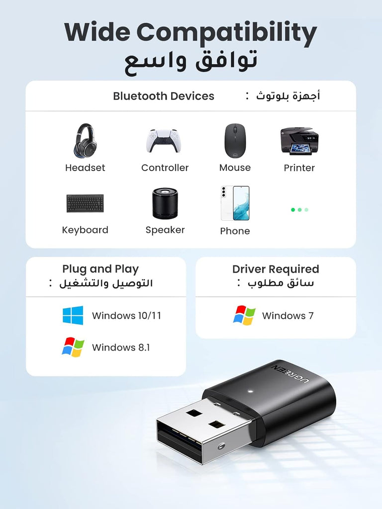 • Name : UGREEN Bluetooth 5.0 Adapter for PC, Plug and Play Dongle USB Bluetooth Receiver & Transmitter for Windows 11/10/8.1, Laptop, Keyboard, Mouse, Speaker, Headphone, Game Controller
