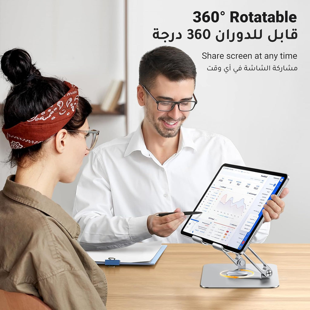 • 【360° Rotating Design】This metal ipad stand allows you to 360° rotate your ipad from both direction with its swivel base. With it, you can easily adjust your iPad to the optimal viewing angle and share your iPad screen with your colleagues, which is useful for group projects or meetings.