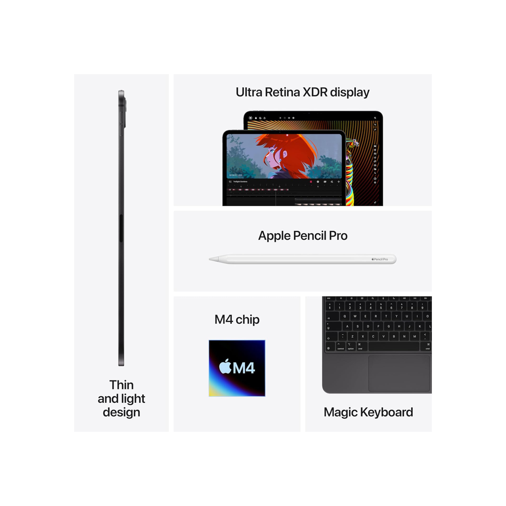 APPLE PENCIL AND MAGIC KEYBOARD FOR IPAD PRO—Apple Pencil Pro transforms iPad Pro into an immersive drawing canvas and note‑taking device. Apple Pencil (USB-C) is also compatible with iPad Pro. Magic Keyboard for iPad Pro features a thin and light design, great typing experience and a built‑in glass trackpad with haptic feedback, while doubling as a protective cover for iPad. Accessories sold separately.