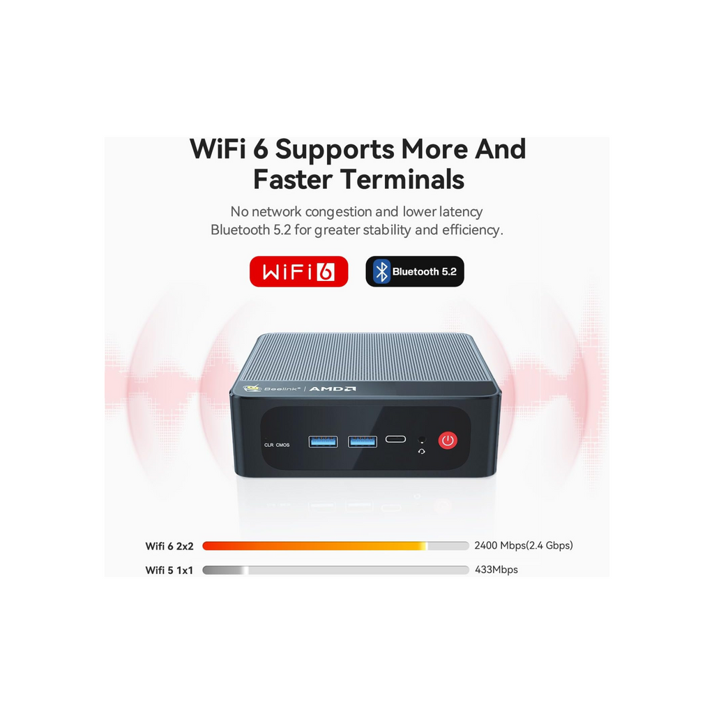 🔥【WiFi 6 & Bluetooth 5.2 】This beelink mini computer is equipped with WiFi 6(802.11ax) with transmission speed up to 2.4Gbps, low latency and fast speed. Bluetooth 5.2 provides a stable connection with your Bluetooth devices and keeps your desk tidy.