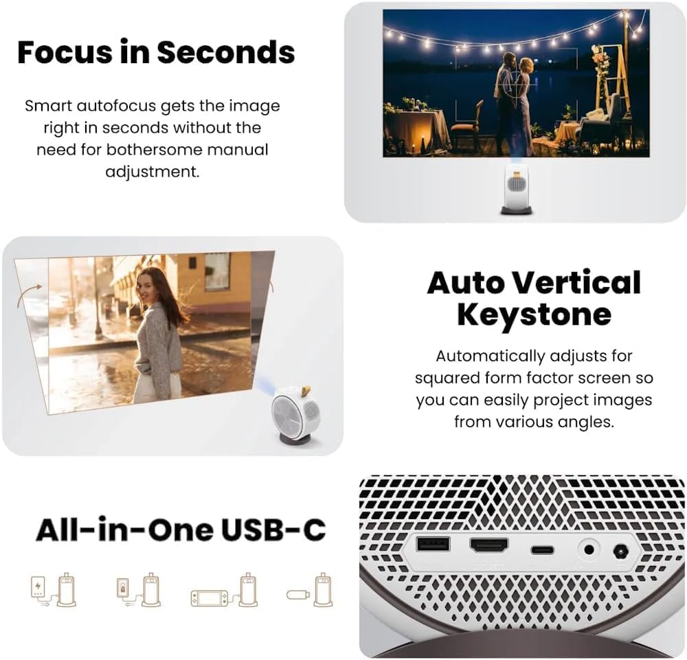 • Ultra-High Definition - Supports up to 4K resolution and 300 ANSI Lumens brightness for stunning clarity, capable of projecting a screen size up to 100 inches.