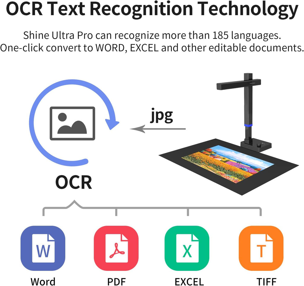 • Versatile Scanner: Shine Ultra Pro can flatten the 3D curved surface after pixel transformation to complete flattening of the book page. Digitize documents to JPG; PDF; Searchable PDF; WORD; EXCEL. Note: CZUR Ultra Pro can scan books while CZUR ET is recommended if professional level is needed