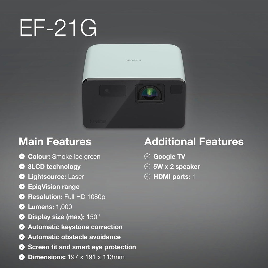 • Name : Epson EF-21 Mini Smart Laser Projector, Full HD, 1000 Lumens, 150 Inch Display with HDR, Google TV, Dolby Atmos Sound, Gaming & Home Cinema – Green