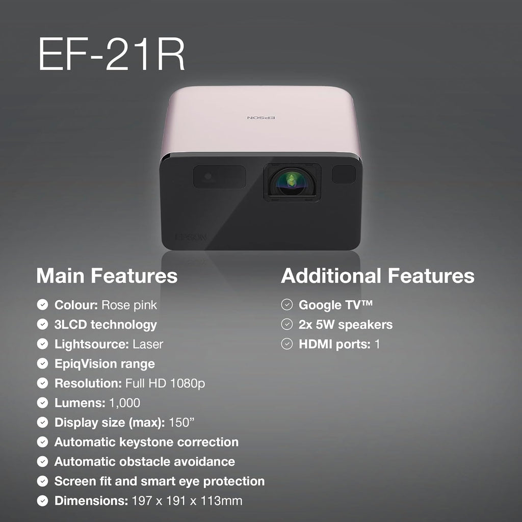 Epson EF-21 Mini Smart Laser Projector, Full HD, 1000 Lumens, 150 Inch Display with HDR, Google TV, Dolby Atmos Sound, Gaming & Home Cinema – Quartz Rose
