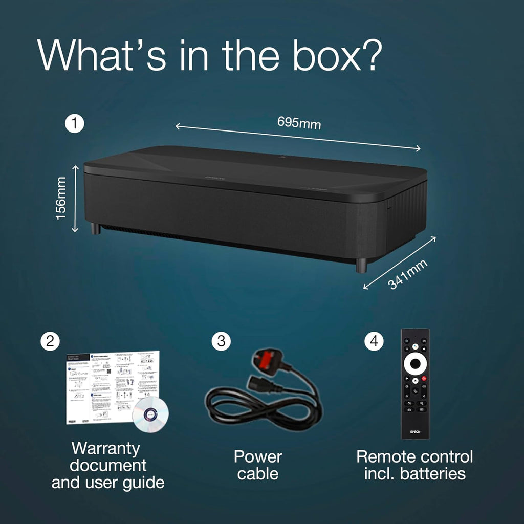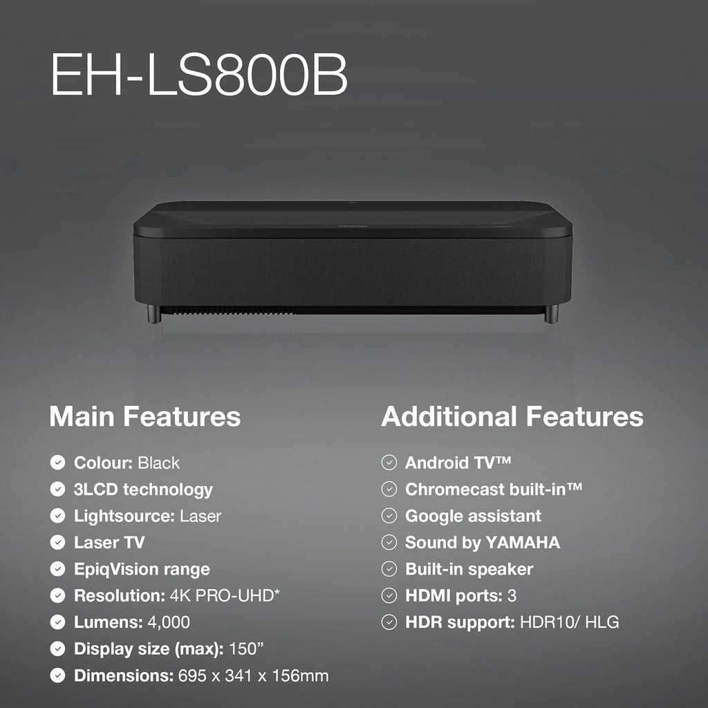 • Name : EPSON EH-LS800B Super-ultra-short-throw projector, smart laser projection TV, 4,000 lumen brightness, 2,500,000:1 contrast ratio, 3LCD technology - Black