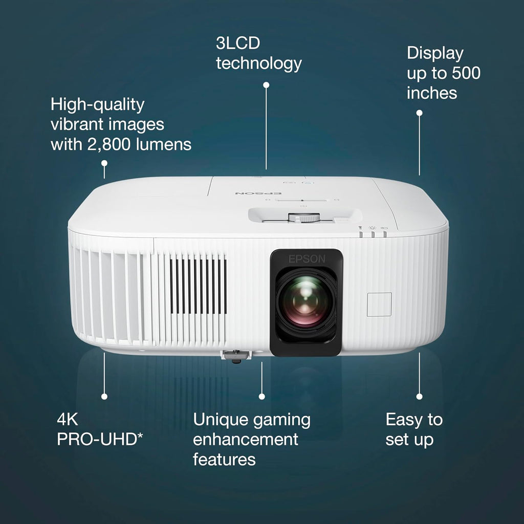 EPSON EH-TW6150 4K PRO-UHD projector, 2,800 lumen brightness, lag time of less than 20ms, 3LCD technology, USB, HDMI