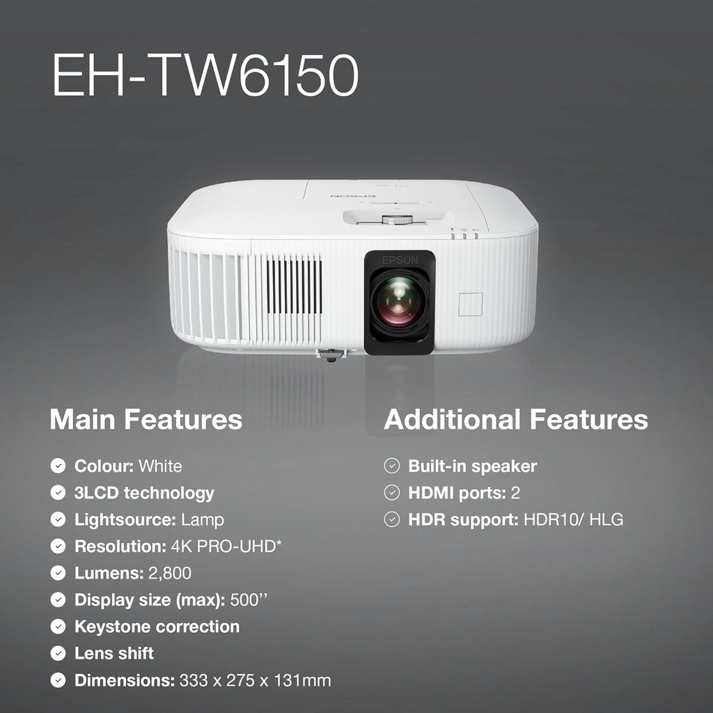 • Name : EPSON EH-TW6150 4K PRO-UHD projector, 2,800 lumen brightness, lag time of less than 20ms, 3LCD technology, USB, HDMI