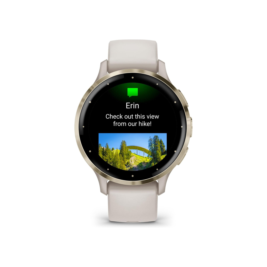 • Experience the vibrant 1.2" AMOLED touchscreen display of the Garmin Venu 3S, designed for clarity and responsiveness. Whether you’re indoors or outdoors, this stunning display ensures that every detail is sharp and colors are vivid, making it easy to read notifications, track workouts, or view health metrics at a glance. The high-resolution screen adjusts to ambient light, providing an exceptional viewing experience in any environment. Stay motivated and connected with the Venu 3S, where style meets functionality in a sleek, lightweight design perfect for any fitness journey.