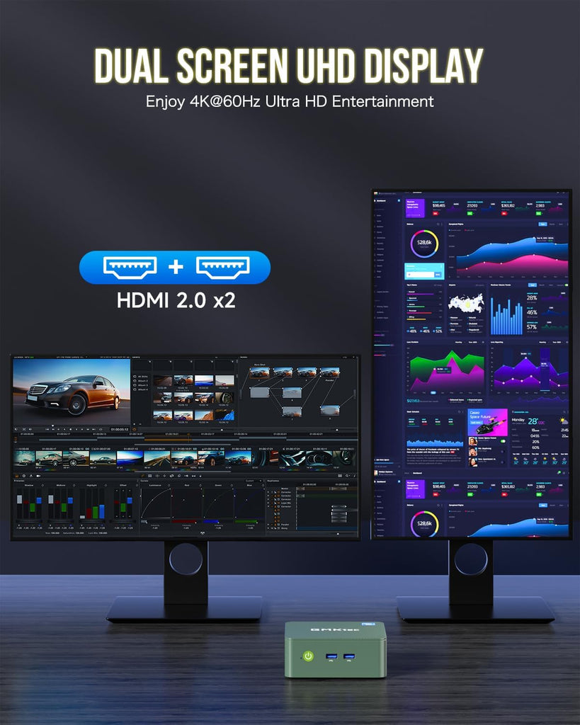 4K DUAL SCREEN DISPLAY - Mini desktop computer is equipped with upgraded Intel Graphics(max 1000MHz), supports 4K video playback and AV1 decoding, connect the pc with a projector as a home theatre, enjoy a variety of entertainments. Two HDMI 2.0 ports allows you to multi-task efficiently on two 4K@60Hz displays.