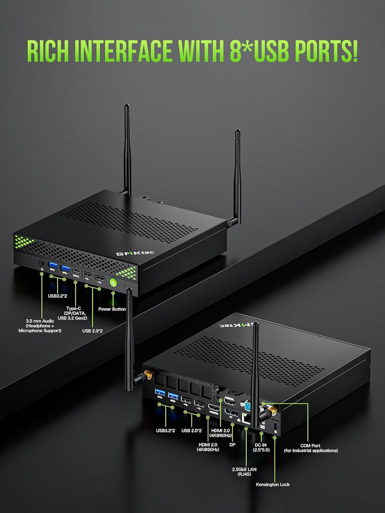 VERSATILE I/O CONNECTIVITY - GMKtec K10 Mini PC offers a wide array of ports to meet diverse needs, including 4×USB 2.0 ports (480 Mbps), 4×USB 3.2 ports (10 Gbps), 2×HDMI 2.0 (4K @ 60Hz), 1×DisplayPort 1.4 (8K @ 60Hz), 1×3.5mm audio jack (headphone + microphone), 1×COM port for industrial and embedded system applications, 1×Type-C (DP/Data, USB 3.2 Gen2, no PD power), 1×2.5G Ethernet RJ45 port, and 1 DC IN (2.5*5.5mm), offering flexibility for various devices and peripherals