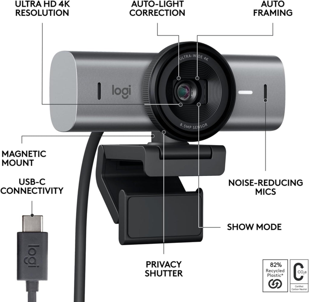 • Name : Logitech MX Brio Ultra HD 4K Collaboration and Streaming Webcam, 1080p at 60 FPS, Dual Noise Reducing Mics, Show Mode, USB-C, Webcam Cover, Works with Microsoft Teams, Zoom, Google Meet - Graphite