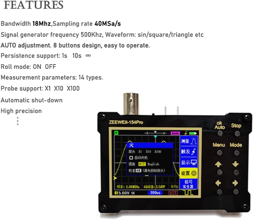 • Easy to Use: Auto adjust, stops, menu and single trigger can all be done with one click. The waveform scaling and movement can be done by simply pressing the Mode button to switch between the 4 directional buttons, which is very convenient.