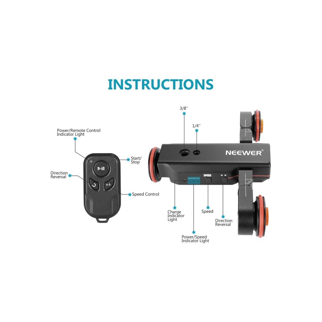 • Name : Neewer Motorized Camera Video Dolly with Scale Indication, Electric Track Skater, Straight Line/Curve/Pitch , Wireless Remote Control, 3 Speed Adjustable for Canon Nikon DSLRs & Phones | AWP013373