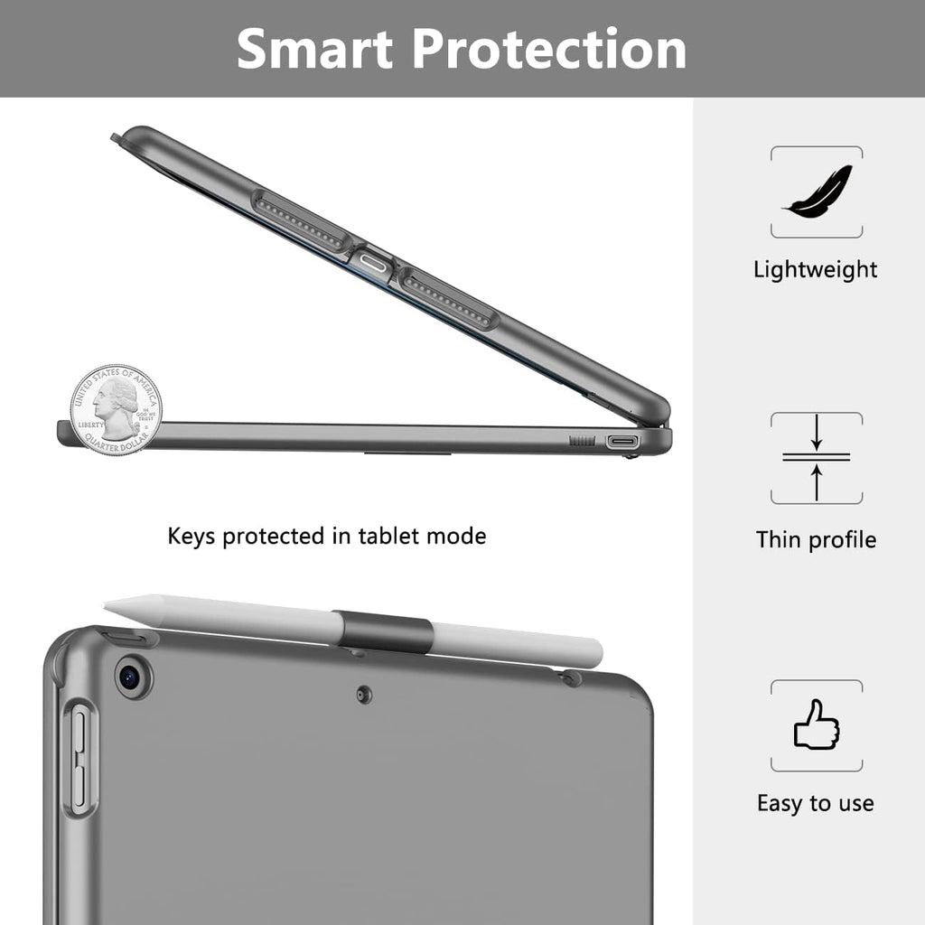 【Smart Protection】 Auto sleep and wake function protects your iPad battery life. The enhanced protection case against scratches, bumps or dents, protecting your iPad from all sorts of dropping accidents. Precise cutouts allow full access to all ports, sensors, speakers, microphone and cameras. *Notice: The keyboard will enter into sleep mode if it doesn't work for 10 minutes, and it will disconnect with your iPad. It will wake up and connect to your iPad again when pressing any key
