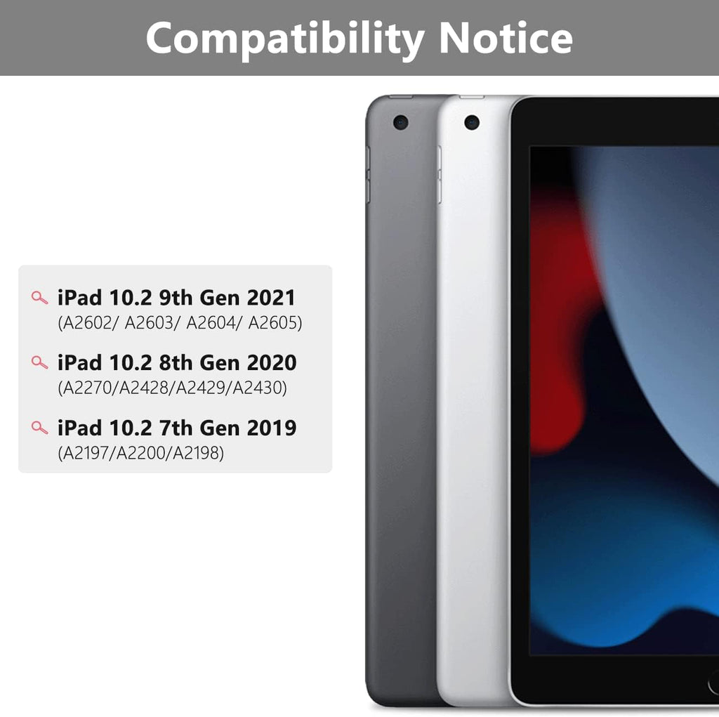 【For iPad Keyboard 10.2 Case with Keyboard】 :Ultra slim keyboard case is perfectly compatible with New iPad 9th Gen 10.2 inch 2021 (A2602/ A2603/ A2604/ A2605),For iPad 8th Gen 10.2 inch 2020 (A2270/A2428/A2429/A2430), For iPad 7th Gen 10.2 inch 2019 (A2197/A2200/A2198). Please check the model number starting with "A" on the back of your iPad before purchasing