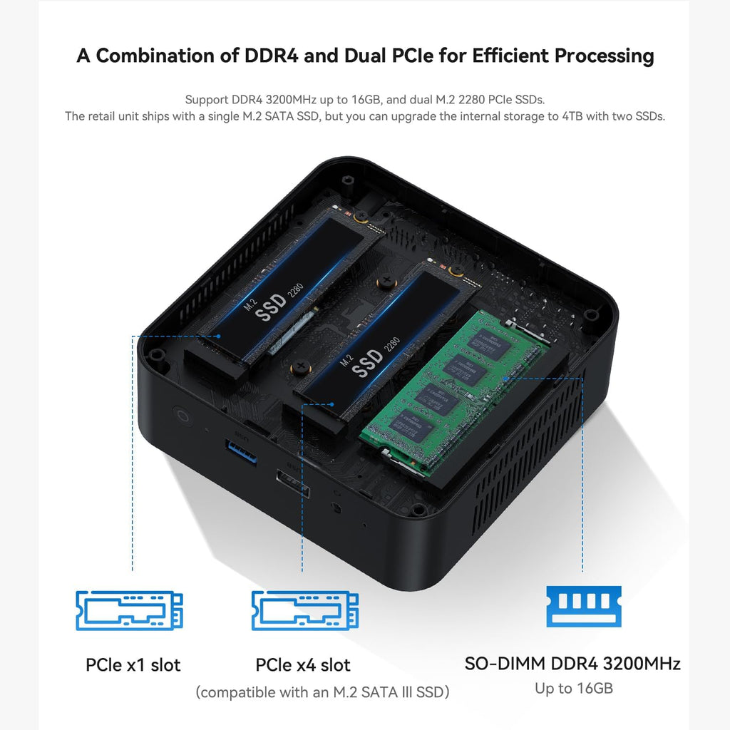 ⚡【16G DDR4 500G SSD & Expansion Storage】The mini computer comes with built-in single-channel 16GB DDR4 RAM (max 3200MHz) and 500GB M.2 PCIeX4 SSD (compatible with SATA3 SSD). Also, you can add an SSD to expand another channel, up to 2TB (not included). More space to meet your storage requirements for files, applications, etc.
