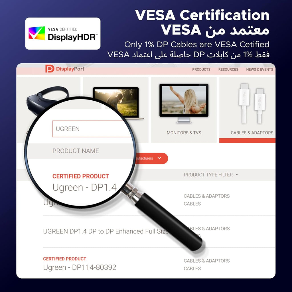 • The DisplayPort 1.4 cable supports up to 7680x4320 resolution, up to 32.4Gbps bandwidth transmission speed, up to 7680x4320 resolution and up to 8K @ 60Hz, 4K @ 144Hz, 2K @ 165Hz refresh rate. UGREEN 8K DP cables not only comply with the VESA standard, but also support dynamic HDR and HDCP 2.2. DisplayPort 1.4 cable is backward compatible with DisplayPort 1.3/1.2.