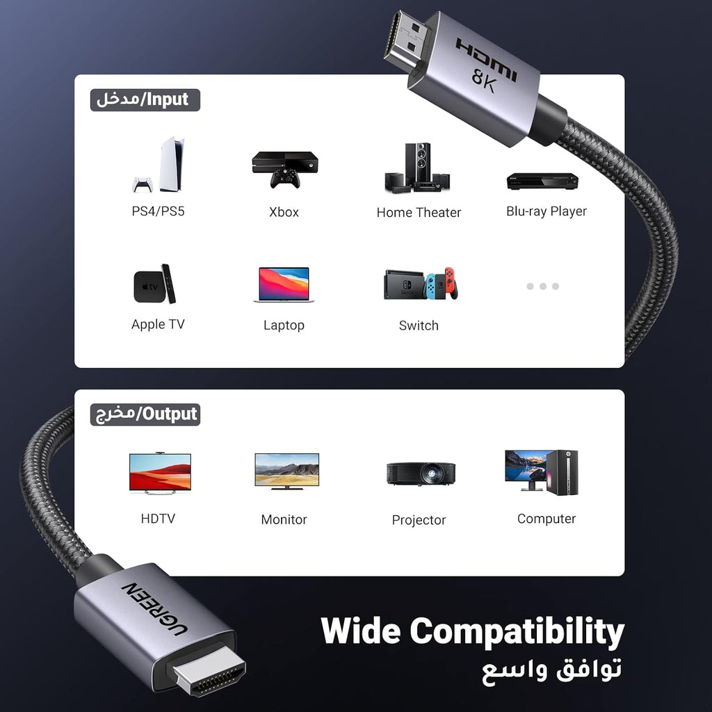 【Wide Compatibility】UGREEN HDMI to HDMI 2.1 cable is compatible with all kinds of devices. 【Input Devices】 Game consoles: PS5/PS4/PS3/ Steam Deck/ Xbox One X/Xbox Series X /Nintendo Switch...Laptop: 2021 MacBook Pro 14""/16""(M1 Pro/Max), Acer/Razer/Thunderobot/Dell/HP. TV Box: Apple TV, Xiaomi TV, Fire TV...Sound Bar: Sony/LG/Nikai/Impex/Yamaha/Denon/Bose. 【Output Devices】 TV&Projector: Samsung/Apple/Hisense& Wownect/BenQ/Xiaomi.