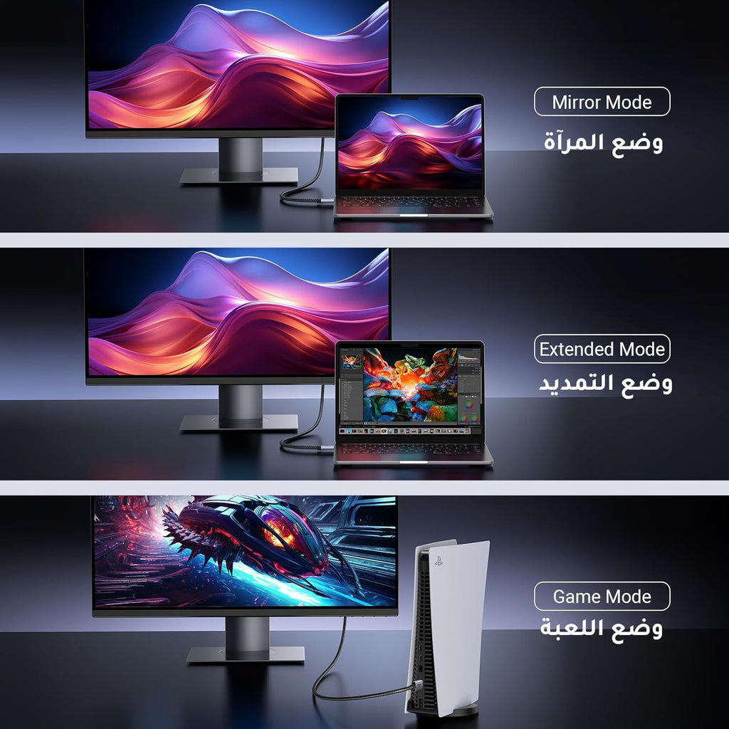 【Multiple Display Modes】HDMI 2.1 UGREEN 8K cable supports three display modes: 【Mirror Mode】 The picture of display device is the same as source device, which is suitable for playing videos or images of the laptop on a TV or monitor. 【Extend Mode】 The picture of display device is different from source device, which is suitable for working or conference. 【Game Mode】 Connect your PS5, Nintendo switch, Steam and other game consoles with HDTV, and immersively playing games.