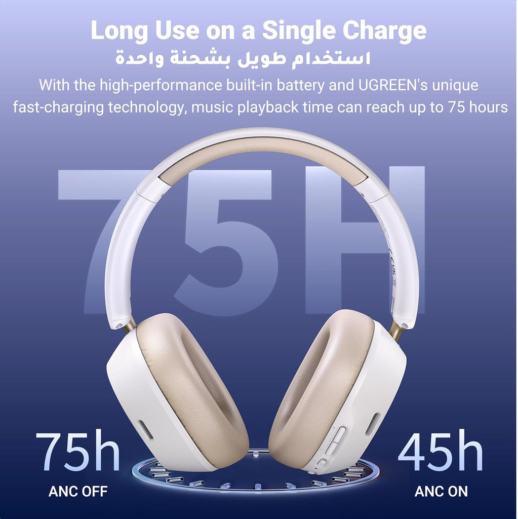 【Ultra-long Battery Life & Fast Charging】The over-ear headphones can be fully charged in just 1.5 hours. With long battery life (45 hrs-ANC Off, 75 hrs-ANC On), UGREEN headphones can be used for a week after a single charge in case of frequent use and even for two weeks in case of casual use. With just 5 minutes of charging, the earphones can be used continuously for 5 hours.