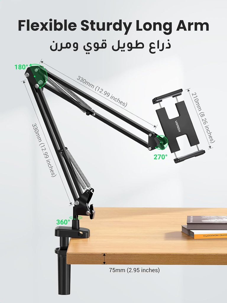 • 【Hands-Free, Carefree】 UGREEN Tablet Mount holds your phone or tablet firmly at an ideal distance and a perfect viewing angle. The Long Arm Clamp secures your tablet in position and offers comfortable hands-free video call, reading and watching experience while you are standing, sitting, or lying in bed.